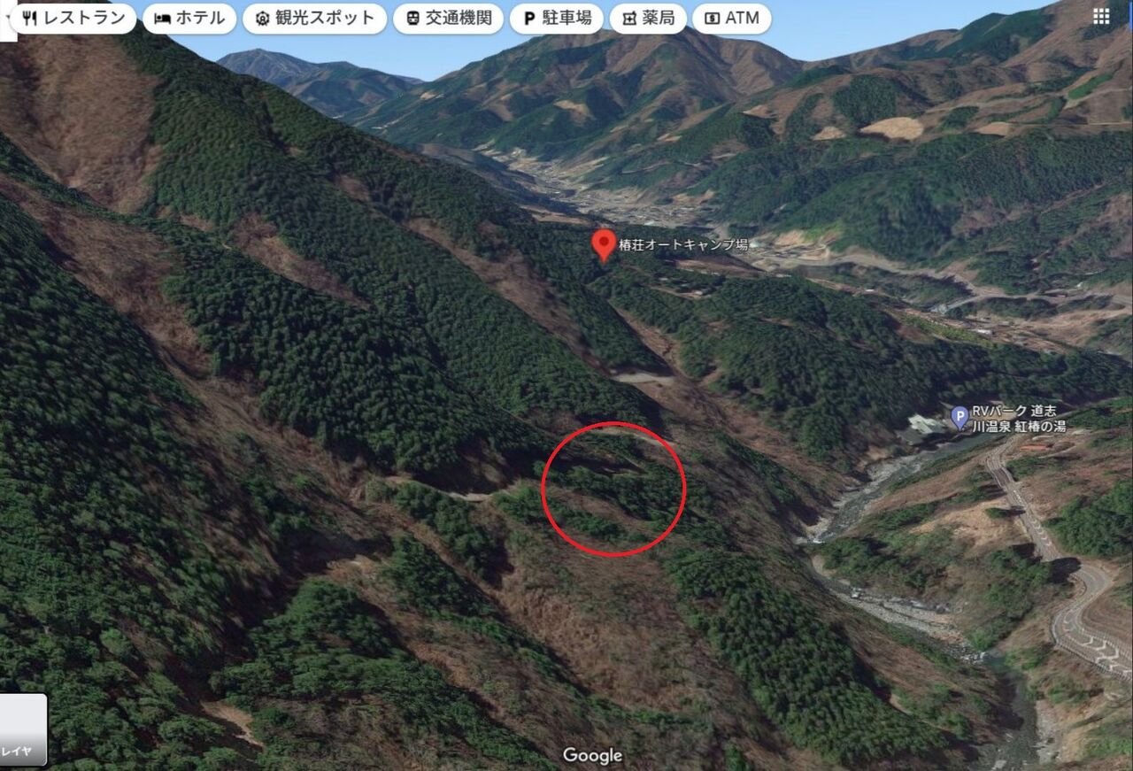 赤丸の辺りが発見現場で奥の方がいなくなったキャンプ場なんだけど